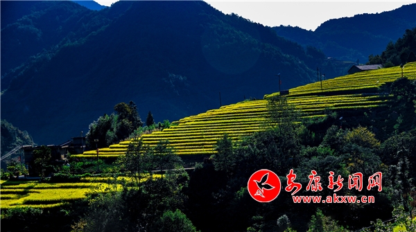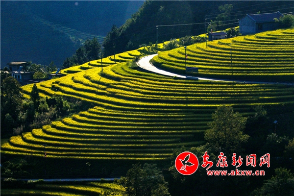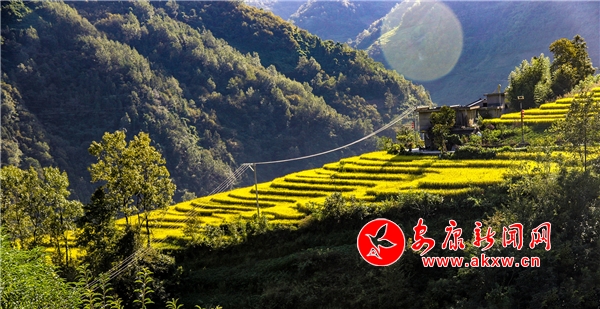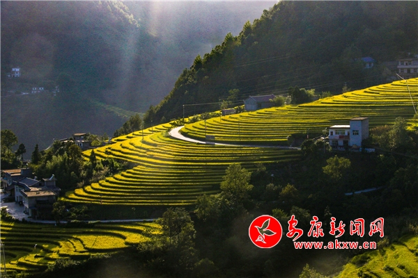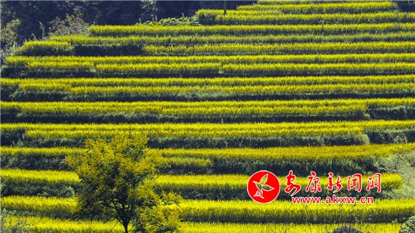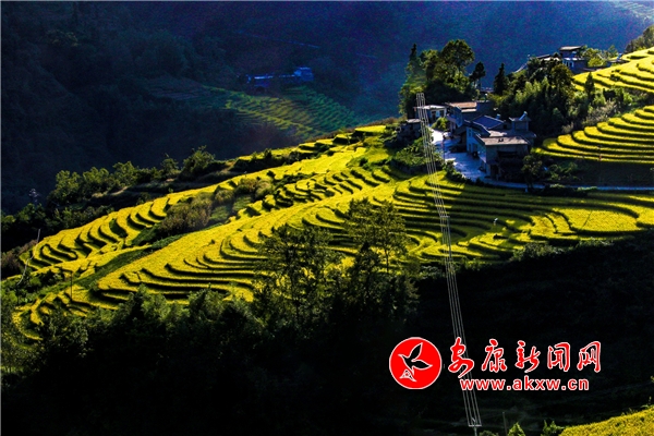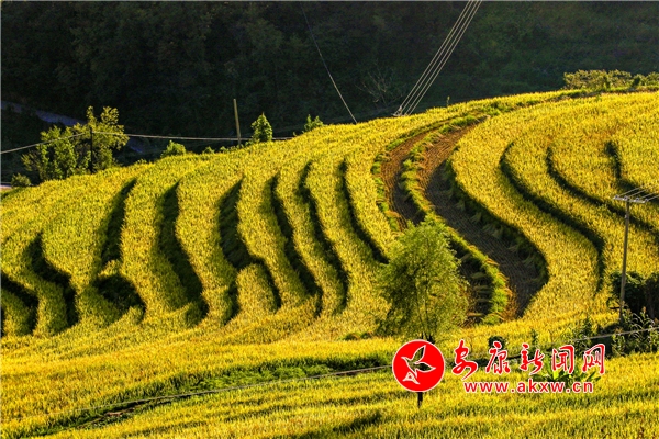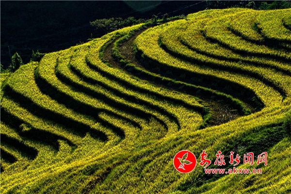 放眼望去,黃亮亮的稻谷,層層疊疊,從山底一直鋪到半山腰。水田都是依山而修,隨山形而變,高差均是隨坡放緩,形狀雖不十分規(guī)則卻也精巧,動(dòng)人之處全在自然的水平線(xiàn)上。