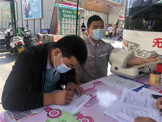 家在西安的劉盼與妻子分屬兩地工作,每逢節(jié)假日他都會開車來安康與妻子一起團(tuán)聚,中秋這天照例和妻子出門過二人世界的劉盼在獻(xiàn)血車前停下了腳步?!吧洗卧谖靼搏I(xiàn)血都好幾年前了,今天日子好,我去獻(xiàn)個血吧?”說完劉盼拉著妻子一起上了獻(xiàn)血車。等待初篩結(jié)果過程中,他一直拉著妻子的手說笑,夫妻倆顯得親密無間。檢驗結(jié)果合格后劉盼很爽快地要捐獻(xiàn)400毫升血液。