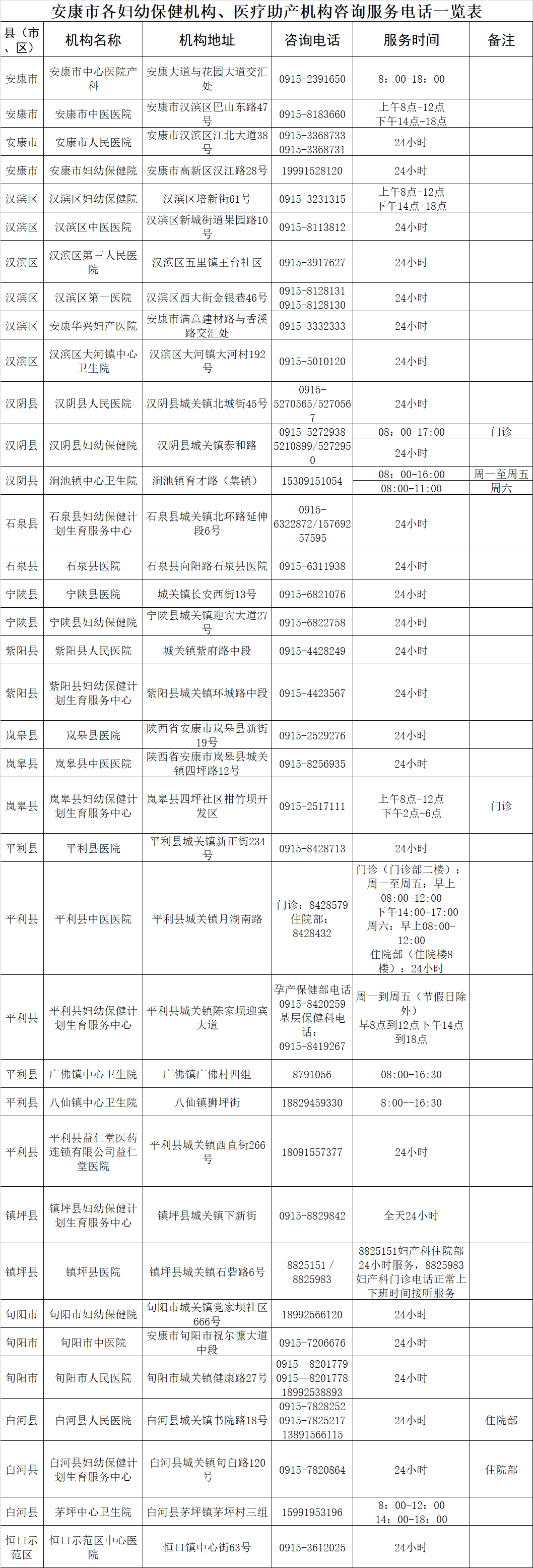安康市各婦幼保健機(jī)構(gòu)、醫(yī)療助產(chǎn)機(jī)構(gòu)咨詢服務(wù)電話