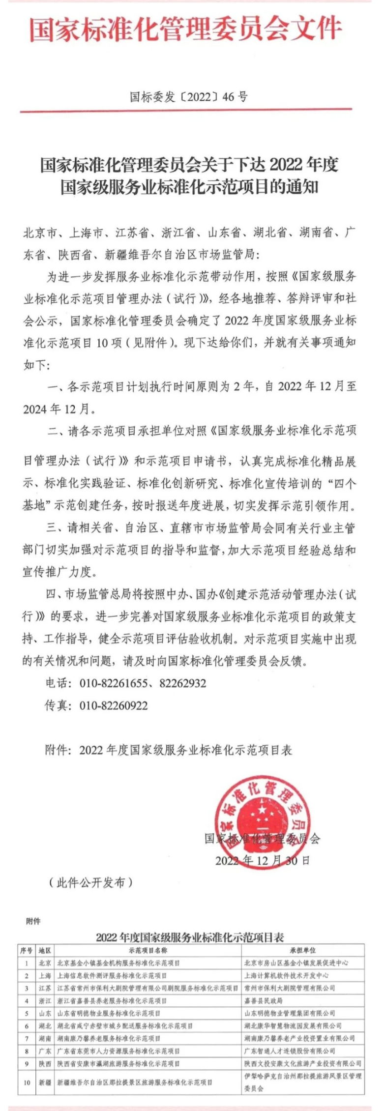 2022年12月30日,國(guó)家標(biāo)準(zhǔn)化管理委員會(huì)下達(dá)全國(guó)十個(gè)國(guó)家級(jí)服務(wù)業(yè)標(biāo)準(zhǔn)化示范項(xiàng)目,“陜西省安康市瀛湖旅游標(biāo)準(zhǔn)化示范項(xiàng)目”,經(jīng)過(guò)資審、文審、選拔、答辯、公示等程序,從全國(guó)一百余家單位中脫穎而出、光榮上榜,成為陜西省第一個(gè)國(guó)家級(jí)旅游標(biāo)準(zhǔn)化示范項(xiàng)目。