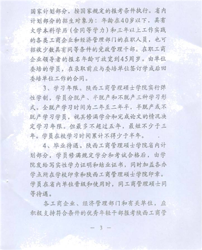 按照省政府有關文件規(guī)定,學員修滿規(guī)定的課程學分,完成畢業(yè)論文,通過論文答辯及評審后,由陜西工商管理碩士學院頒發(fā)畢業(yè)證書和學力證明。學員在省內單位晉級和使用時,視同工商管理碩士。