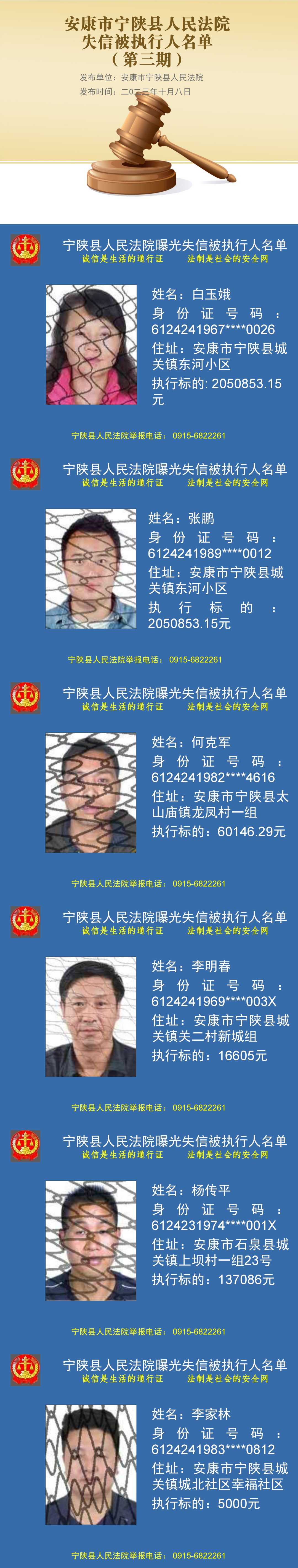 為維護司法權威,推動社會誠信體系建設,促使被執(zhí)行人履行生效法律文書確定的義務,根據(jù)《中華人民共和國民事訴訟法》第二百五十五條和《最高人民法院關于公布失信被執(zhí)行人名單信息的若干規(guī)定》的規(guī)定,被執(zhí)行人具有履行能力而不履行生效法律文書確定的義務,人民法院應當將其納入失信被執(zhí)行人名單,依法對其進行信用懲戒。現(xiàn)將安康市寧陜縣人民法院2023年第三期失信被執(zhí)行人名單予以公布。