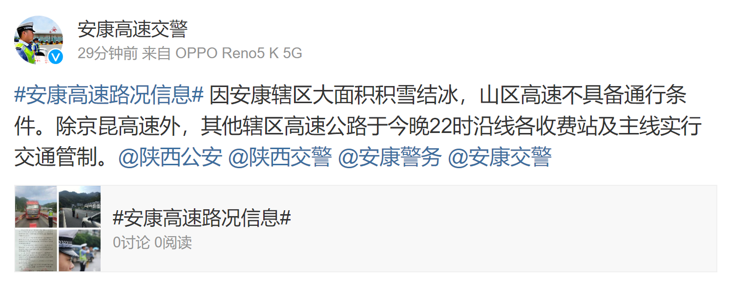 據(jù)安康高速交警消息:因安康轄區(qū)大面積積雪結(jié)冰,山區(qū)高速不具備通行條件。除京昆高速外,其他轄區(qū)高速公路于今晚(2月22日)10時沿線各收費站及主線實行交通管制。?