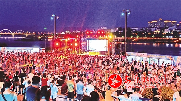 夜幕降臨,酷炫的舞臺霓虹閃耀、彩燈環(huán)繞、亮如白晝,音樂節(jié)在一曲《別非要我大聲說出來》中拉開帷幕,可容納千人的親水廣場人聲鼎沸、接踵摩肩,往來嬉戲游玩、親水樂水、觀看表演的群眾絡繹不絕。樂隊貝斯手、吉他手撥動琴弦,現(xiàn)場觀眾紛紛揮舞著手中的熒光棒,跟隨音樂盡情搖擺、合唱,隨著《稻香》《簡單愛》《夢醒時分》等一首首經(jīng)典歌曲的演唱,現(xiàn)場氣氛熱烈、高潮迭起。