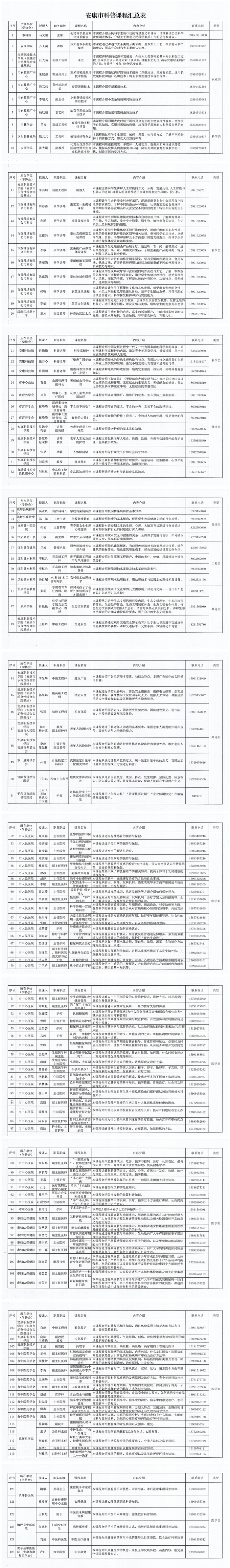 為認(rèn)真落實(shí)《安康市貫徹<全民科學(xué)素質(zhì)行動規(guī)劃綱要(2021-2035年)實(shí)施方案》,增強(qiáng)我市科普供給能力,助力提升全民科學(xué)素質(zhì),經(jīng)前期征集、審核整理,形成了安康市科普課程,共計125門課,內(nèi)容包括但不限于科學(xué)技術(shù)、農(nóng)業(yè)技術(shù)、工程技術(shù)、衛(wèi)生保健、生態(tài)環(huán)保、應(yīng)急處置、運(yùn)動健康、生活常識、網(wǎng)絡(luò)安全等科普知識?,F(xiàn)將安康市科普課程予以公布,并就有關(guān)事項通知如下: