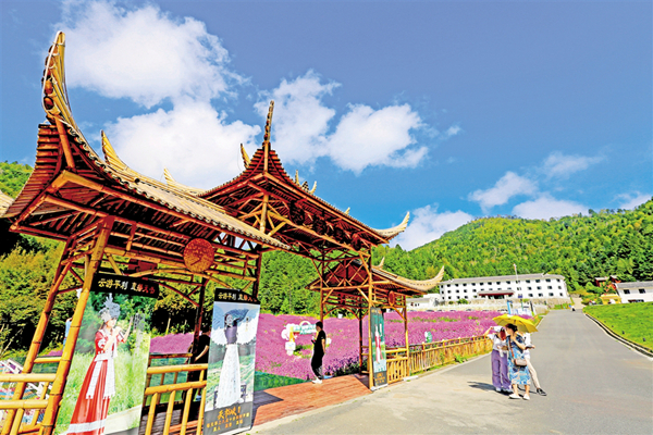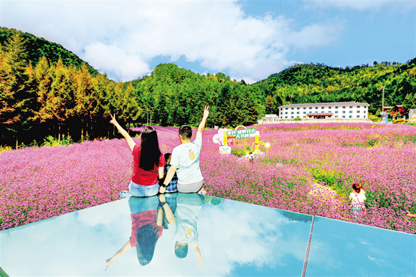中秋節(jié)期間,平利千家坪森林公園天書峽馬鞭草花競(jìng)相怒放。如畫的景色吸引眾多游客前來(lái)賞景打卡。(詹永桂 攝)