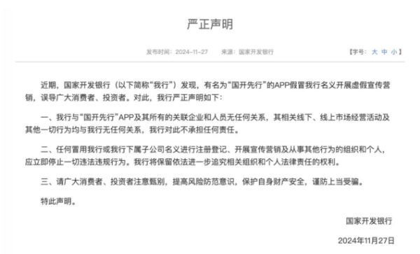 詳情:近期,有名為“國(guó)開(kāi)先行”的APP假冒國(guó)家開(kāi)發(fā)銀行名義開(kāi)展虛假宣傳營(yíng)銷,誤導(dǎo)廣大消費(fèi)者、投資者。對(duì)此,國(guó)家開(kāi)發(fā)銀行于11月27日在官網(wǎng)發(fā)布《嚴(yán)正聲明》:
