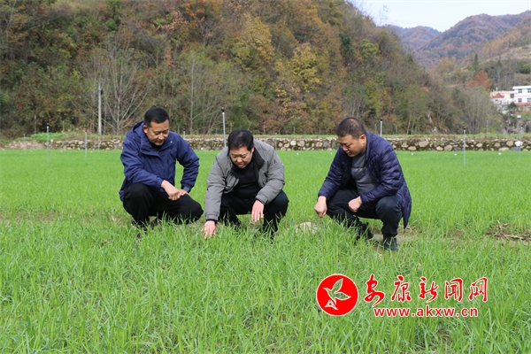 大河鎮(zhèn)先鋒社區(qū)第一書記馬鵬和市區(qū)農(nóng)技中心的專家在進行冬小麥品種試驗
