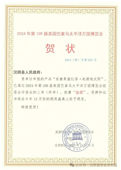 “安康果蜜紅·起源地漢陰”榮獲美國巴拿馬萬國博覽會金獎