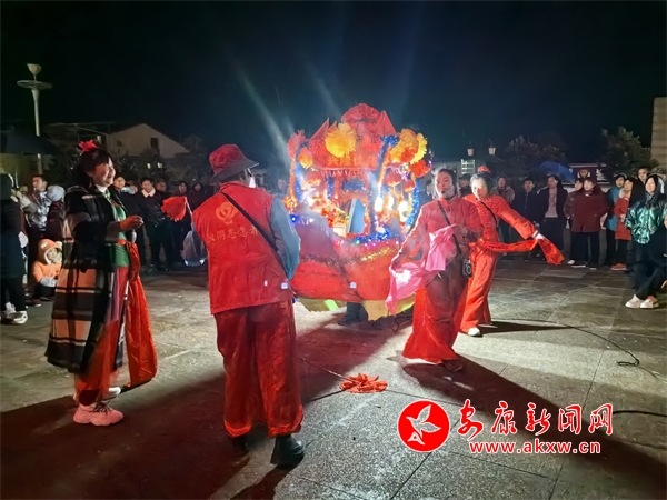 在位于漢陰縣平梁鎮(zhèn)的興隆佳苑社區(qū),春節(jié)期間,小區(qū)里處處洋溢著節(jié)日氛圍。夜幕降臨,社區(qū)廣場響起陣陣鑼鼓聲,?;ù硌菡介_始。只見表演者雙手提船、配合默契,船體隨著“波浪”旋轉(zhuǎn)、顛簸,身穿喜慶艷麗的服裝、頭戴五彩頭飾的表演人員個(gè)個(gè)精神抖擻,一邊前行,一邊唱著漢陰本地的花鼓戲,祈求來年風(fēng)調(diào)雨順、福壽安康。翻飛的彩扇、華麗的彩船,精心編排、詼諧幽默的表演,為社區(qū)群眾呈現(xiàn)了一場精彩的視覺盛宴。