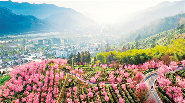 沿著茶山步道拾級(jí)而上,茶農(nóng)采青的竹簍與游人拍照的紗巾在梯田間次第閃現(xiàn)。粉白相間的梅花如云絮般綴滿枝頭,風(fēng)過處,花瓣簌簌落入茶叢,為嫩綠的新芽染上淡淡馨香。遠(yuǎn)處黛瓦白墻的徽派民居與近處起伏的茶壟構(gòu)成天然畫框,無人機(jī)視角下,蜿蜒的茶道如同玉帶纏繞山腰,將紅楓、櫻花、梅林串成斑斕的珠鏈。