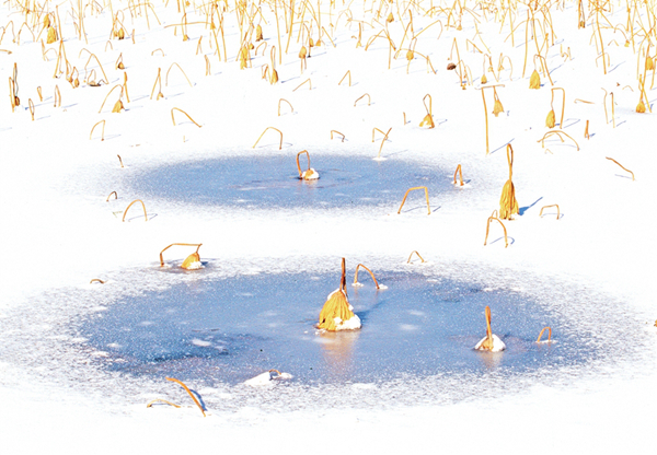 我的攝影創(chuàng)作圍繞生命的痕跡、時間的隱喻兩個主題。在《嘉實擷芳·野圃瑤音》中,菜園的微觀生態(tài)被賦予交響樂般的節(jié)奏——葫蘆藤的螺旋曲線是生命的律動,西紅柿根莖的垂直排列是生長的秩序,蚜蟲蝕痕的細節(jié)則暗喻生態(tài)的共生與抗?fàn)?。而在《澄漪棹影·沙月溯光》里,榮成海岸的冬夏對比成為時間的隱喻,結(jié)冰湖面上的凋敗蓮蓬是流逝凝固的時光,夏日海邊的金色水洼則是流動的永恒。我癡迷于捕捉這種矛盾與共生——就像用冷暖色調(diào)碰撞出畫面的張力,也用虛實構(gòu)圖處理每一張照片,期待每一張照片是個性鮮明,讓人耳目一新。
