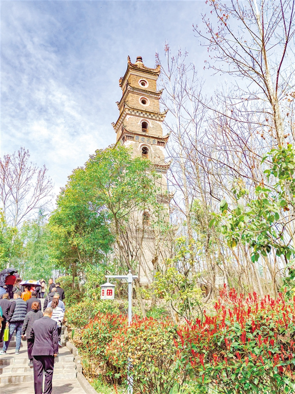 這時,塔側(cè)傳來歡快的鑼鼓聲,循聲望去,是一段十幾米的孝義文化長廊,一組男女或站或坐敲打著響器,使奠安塔不再寂寞。廊道的另一頭連接著奠安公園,環(huán)形觀景步道上擠滿了游覽的人。春分時節(jié),杏花正在萌發(fā),桃花含苞待放,倒是紅葉李花開正艷,細(xì)小如甲的花瓣布滿枝頭,零落軟泥上,雪白一片,仿佛成了李花的世界。舉目四望,花草清新,小學(xué)生在撿拾垃圾,胸前的紅領(lǐng)巾在陽光的照射下熠熠生輝,與周遭綠植映襯,絢爛了滿園春色。