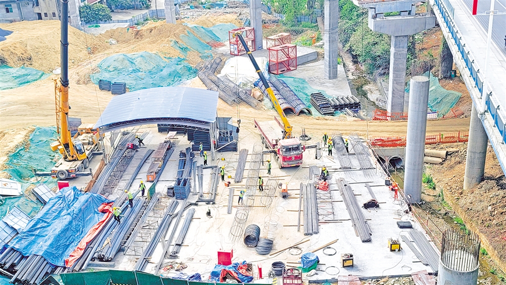 4月9日,七里溝立交橋項(xiàng)目建設(shè)現(xiàn)場一角,施工者正在綁扎鋼筋。 周亭松 攝
