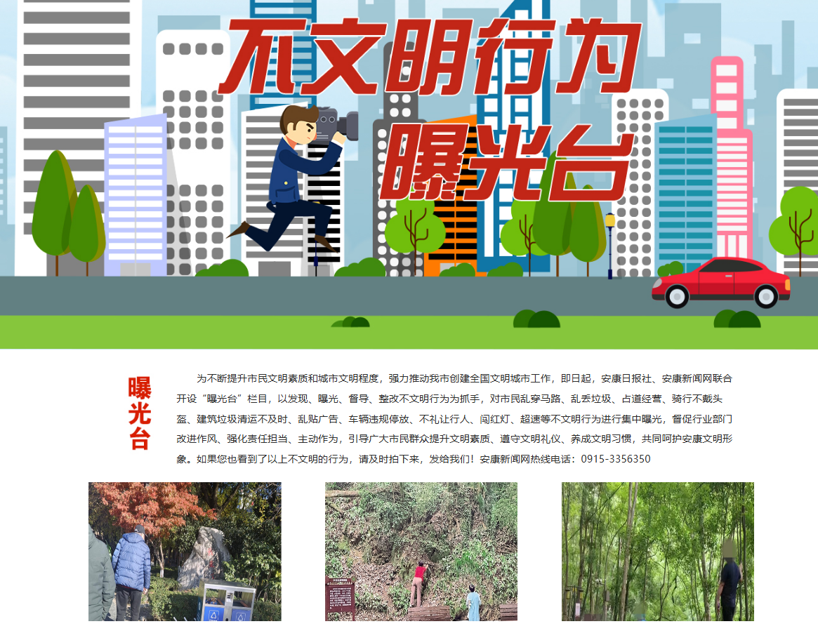安康新聞網(wǎng)繼續(xù)充分發(fā)揮輿情監(jiān)測和輿論監(jiān)督作用,以高度負(fù)責(zé)的態(tài)度,及時監(jiān)測上報重大輿情信息。開設(shè)《不文明行為曝光臺》輿論監(jiān)督專欄,集中曝光身邊的不文明現(xiàn)象、行為,發(fā)布消息報道19篇,引導(dǎo)市民群眾自覺規(guī)范文明行為,主動融入城市文明創(chuàng)建熱潮,為提升市民文明素質(zhì)和城市文明程度貢獻媒體力量,體現(xiàn)地方黨媒的責(zé)任與擔(dān)當(dāng)。