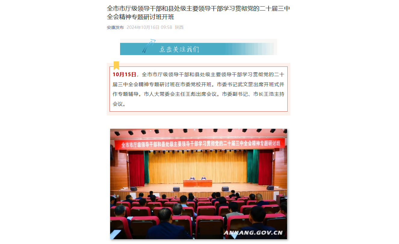 《全市市廳級領(lǐng)導(dǎo)干部和縣處級主要領(lǐng)導(dǎo)干部學(xué)習(xí)貫徹黨的二十屆三中全會精神專題研討班開班》(2024-10-16發(fā)布于安康發(fā)布公眾號)