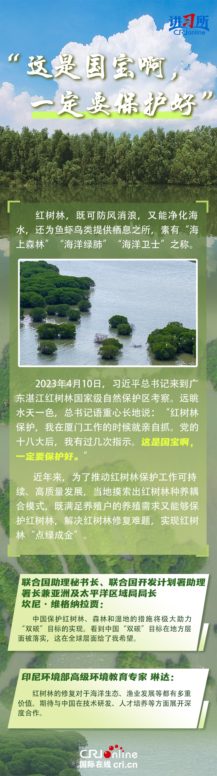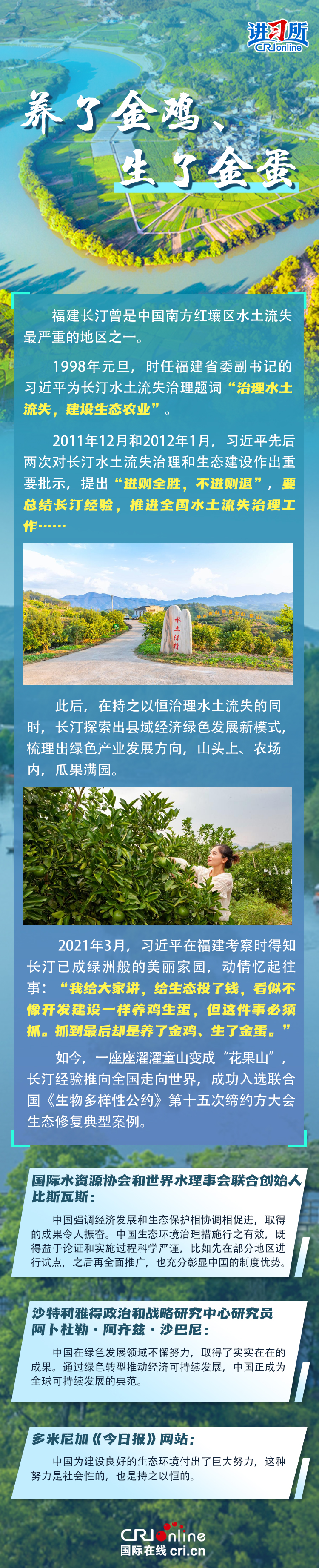 新時(shí)代以來,在習(xí)近平生態(tài)文明思想的科學(xué)指引下,“兩山”理念已深入人心,從“點(diǎn)綠成金”的紅樹林到一座座“花果山”,再到走向世界的長(zhǎng)汀經(jīng)驗(yàn)……美麗中國建設(shè)邁出重大步伐,生態(tài)環(huán)境保護(hù)發(fā)生歷史性變化。國際社會(huì)認(rèn)為,中國取得廣泛的綠色發(fā)展成就,從根本上源于習(xí)近平生態(tài)文明思想,特別是“兩山”理念的指引。在通過綠色轉(zhuǎn)型推動(dòng)經(jīng)濟(jì)可持續(xù)發(fā)展方面,中國正成為全球可持續(xù)發(fā)展的典范。