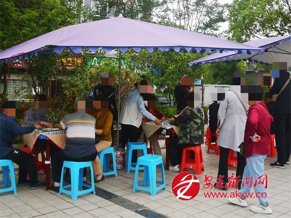 5月14日,記者實(shí)地走訪發(fā)現(xiàn),廣場(chǎng)上的確有人撐著遮陽傘,擺放3桌手碼麻將供人打。廣場(chǎng)中心的花壇里,也同樣撐著遮陽傘,擺了2桌麻將。而公廁后面的涼亭里、供水房前面及金堂寺方向的人行道上則成了撲克牌區(qū),分散的三個(gè)地方總計(jì)有20桌以上,每張桌上都有4人在“挖坑”。