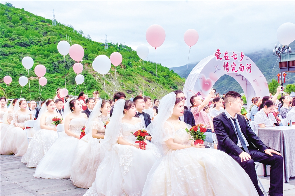 ?8月29日上午,“愛在七夕·情定白河”2025年白河縣新時代文明實踐集體婚禮主題活動在河街寶石文化廣場浪漫啟幕。來自各行各業(yè)的8對“珍珠婚”夫婦、8對新人齊聚一堂,通過分享婚姻保鮮秘訣、頒發(fā)結(jié)婚證、簽訂承諾書、開展婚姻家庭輔導(dǎo)等簡約而莊重的儀式,在各界代表和親朋好友的見證祝福下,開啟幸福婚姻新篇章,用實際行動踐行婚事新辦、喜事儉辦的文明新風尚。(紀道婭 攝)