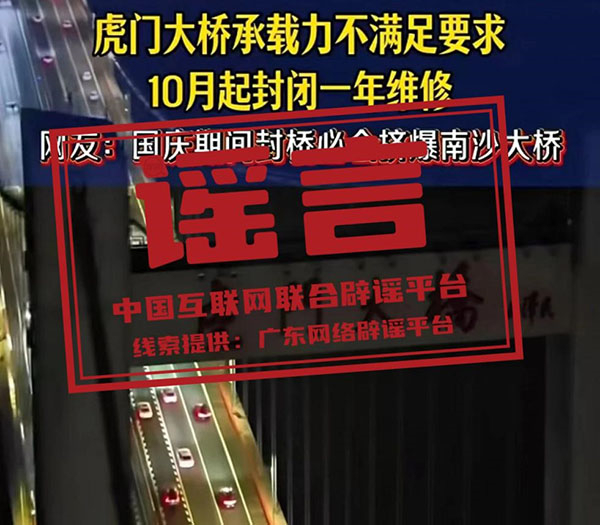 真相:近日,網(wǎng)絡(luò)上流傳“虎門大橋10月起封閉維修”的消息。經(jīng)東莞日報(bào)記者核實(shí),該信息不準(zhǔn)確?;㈤T大橋在國慶假期期間將正常通行且繼續(xù)實(shí)行免費(fèi)政策。9月29日,廣東虎門大橋有限公司明確表示:虎門大橋在2026年春節(jié)前不會采取全封或半封措施,具體封閉時間及方案,目前均未確定。據(jù)悉,此前東莞市發(fā)展和改革局曾發(fā)布過相關(guān)評估前的公示,其中提到預(yù)計(jì)開工時間,但并非實(shí)際施工時間。(來源:“廣東省互聯(lián)網(wǎng)舉報(bào)中心”微信公眾號、東莞日報(bào))