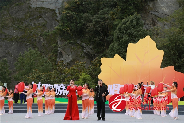 金秋時(shí)節(jié)的茨溝鎮(zhèn),萬(wàn)畝紅葉、層林盡染。伴隨著歡快的鑼鼓聲,茨溝鎮(zhèn)、五里鎮(zhèn)、譚壩鎮(zhèn)三支隊(duì)伍輪番登場(chǎng),不僅獻(xiàn)唱原創(chuàng)村歌,還展示特色產(chǎn)業(yè)、優(yōu)質(zhì)資源與地方文化,紛紛亮出獨(dú)具特色的“看家絕活兒”。歌伴舞《村歌飛揚(yáng)》《松壩謠》《幸福歌兒唱起來(lái)》唱出了鄉(xiāng)親們的幸福生活;以修建八一水庫(kù)為背景的安康歌謠《我來(lái)了》引發(fā)會(huì)場(chǎng)共鳴;民俗表演《龍的傳人》則將節(jié)目推向高潮。舞蹈、鄉(xiāng)村T臺(tái)秀、民俗表演、八岔戲等節(jié)目,或以傳統(tǒng)幽默詼諧的風(fēng)格,或以深情敘述的方式,展現(xiàn)鄉(xiāng)村新生活,為觀眾獻(xiàn)上一場(chǎng)別開(kāi)生面的視聽(tīng)盛宴,現(xiàn)場(chǎng)歡呼聲此起彼伏。
