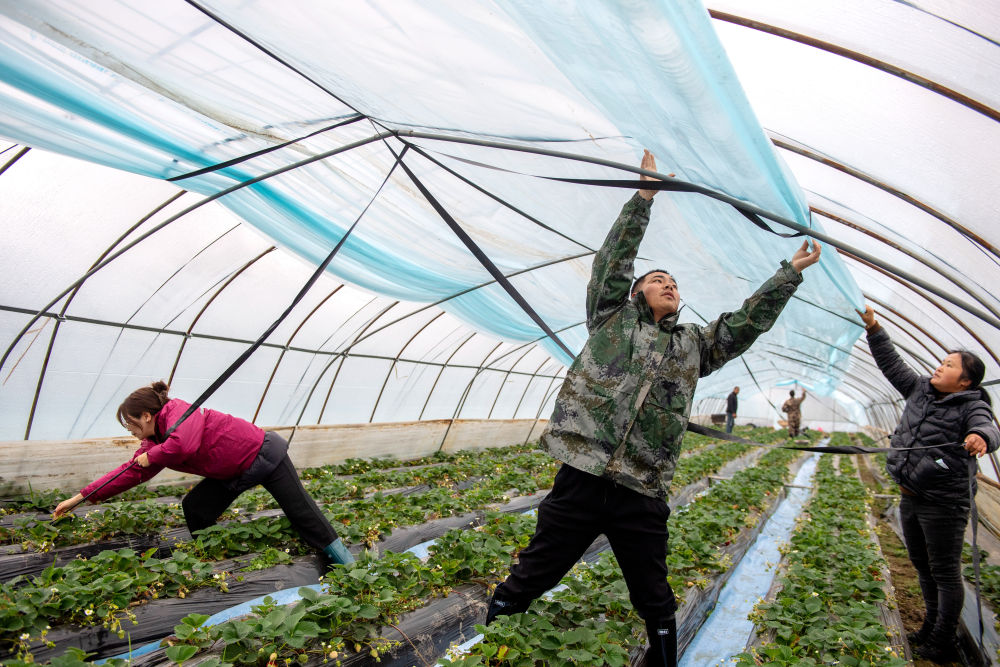 ??2023年12月15日,志愿者在浙江湖州長興縣水口鄉(xiāng)幫助農(nóng)戶加蓋大棚保溫膜。為應(yīng)對(duì)強(qiáng)雨雪天氣,志愿者們幫助農(nóng)戶清理大棚上的積雪,加裝綁棚繩,棚內(nèi)增設(shè)立柱,提高大棚抗風(fēng)雪能力,確保農(nóng)產(chǎn)品正常生產(chǎn)供應(yīng)。