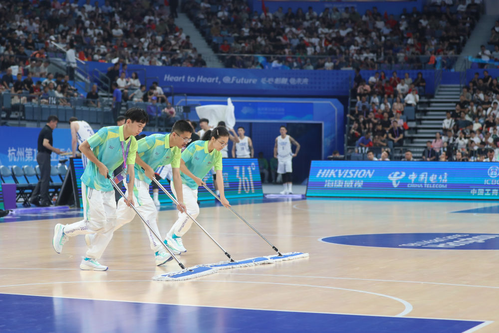 ??2023年9月28日,杭州亞運(yùn)會(huì)志愿者“小青荷”在杭州亞運(yùn)會(huì)籃球男子預(yù)賽B組比賽前清潔場地。從2016年二十國集團(tuán)領(lǐng)導(dǎo)人杭州峰會(huì)以來,“小青荷”這一志愿服務(wù)工作品牌已成為杭州大型賽會(huì)服務(wù)的一張金名片。