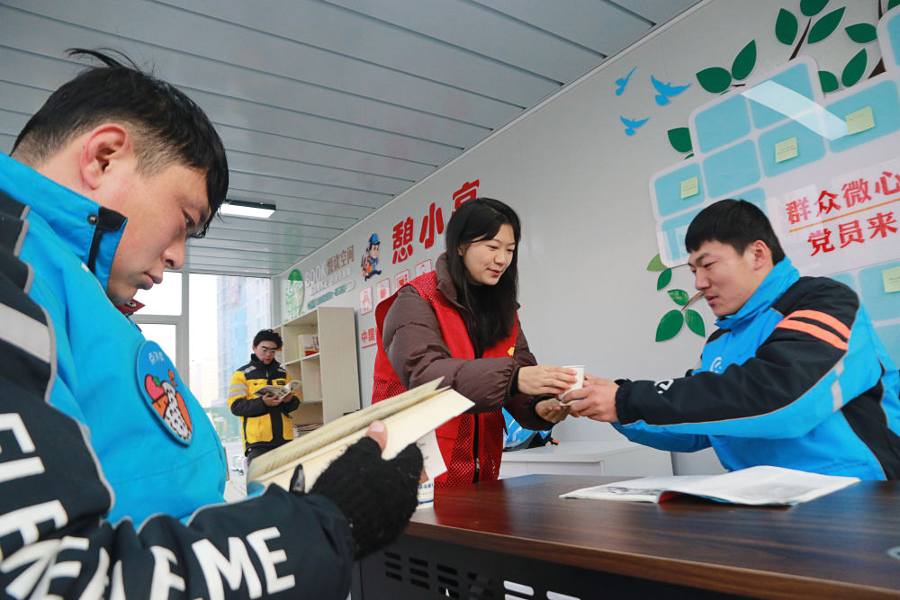 ??2023年12月27日,志愿者在山東省高密市密水街道“憩小亭”服務(wù)站為外賣騎手送上熱水。入冬以來,山東省高密市密水街道推進(jìn)“憩小亭”暖心服務(wù)站建設(shè),為外賣騎手、快遞小哥、網(wǎng)約車司機(jī)、環(huán)衛(wèi)工人等戶外勞動(dòng)者提供飲水、無線上網(wǎng)、食物加熱等多項(xiàng)服務(wù),讓他們感受到冬日里的溫暖。