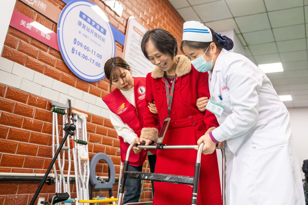 ??2025年11月6日,志愿者及醫(yī)務(wù)人員在湖南長沙望城區(qū)高塘嶺街道中南社區(qū)幫助行動(dòng)不便的居民使用康復(fù)器具。