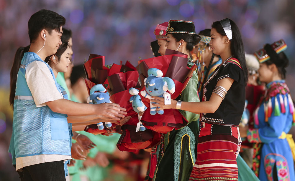 ??2024年11月30日,五十六個(gè)民族代表在海南三亞舉行的第十二屆全國少數(shù)民族傳統(tǒng)體育運(yùn)動(dòng)會(huì)閉幕式上為志愿者獻(xiàn)花。運(yùn)動(dòng)會(huì)期間,數(shù)千名志愿者“小鹿鹿”奔赴十余個(gè)競賽場館、二十多家接待酒店、媒體中心、機(jī)場車站等地,為來自全國各地的運(yùn)動(dòng)員、技術(shù)官員、工作人員和觀眾提供禮賓接待、交通引導(dǎo)、安全保衛(wèi)等志愿服務(wù)。