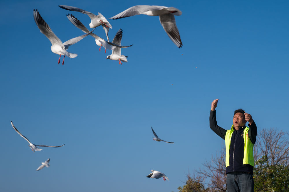 ??2024年12月11日,志愿者張利云在云南昆明王官濕地公園投喂紅嘴鷗。志愿者張利云堅(jiān)持投喂紅嘴鷗長達(dá)十余年,為生態(tài)環(huán)境保護(hù)貢獻(xiàn)個(gè)人力量。