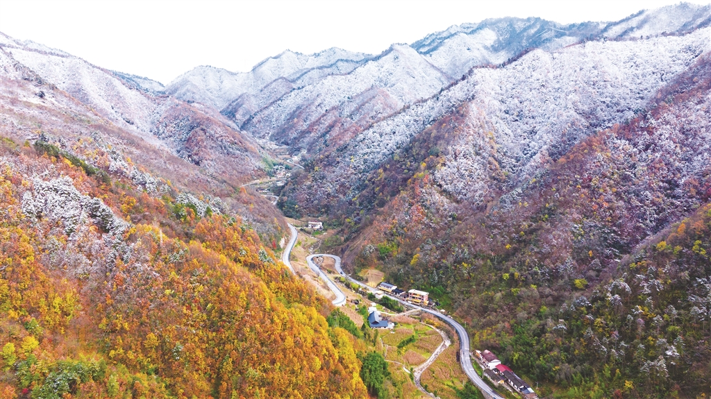 車子繼續(xù)向前,離寧陜越來越近時,車窗外那片銀裝素裹的童話世界竟悄悄退場,再次將五彩斑斕鋪展開來。楓紅未減,葉黃依舊,深綠的枝葉間還凝著點點雪色,像是剛從時光隧道走出一般。陽光不知何時鉆出了云層,照在未化的雪上,泛起細碎的晶瑩。這時的山野,既有秋的飽滿,又有冬的清澈,仿佛一場盛大的交接正在無聲進行,秋不忍盡褪其色,冬亦不忍驟掩其華,于是二者相融,成就了這短暫而珍貴的相遇。