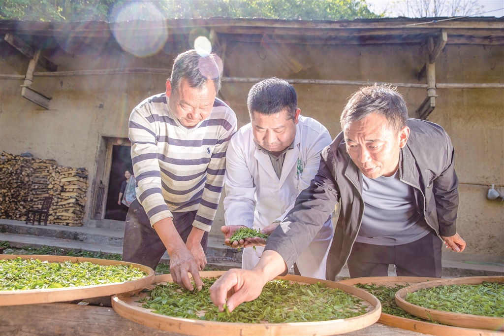 “十四五”期間,我市持續(xù)推進(jìn)茶產(chǎn)業(yè)發(fā)展,努力實(shí)現(xiàn)茶產(chǎn)業(yè)“四時(shí)有收”。圖為紫陽(yáng)白茶非遺制作技藝代表性傳承人在高橋鎮(zhèn)裴壩村,向茶農(nóng)推廣紫陽(yáng)白茶非遺制作技藝。