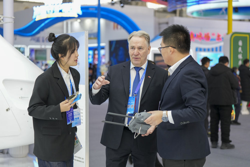 1月6日,在2026哈爾濱國際冰雪經(jīng)濟(jì)博覽會(huì)現(xiàn)場,參會(huì)嘉賓(中)在了解一款工業(yè)無人機(jī)的參數(shù)和性能。新華社記者 王松 攝