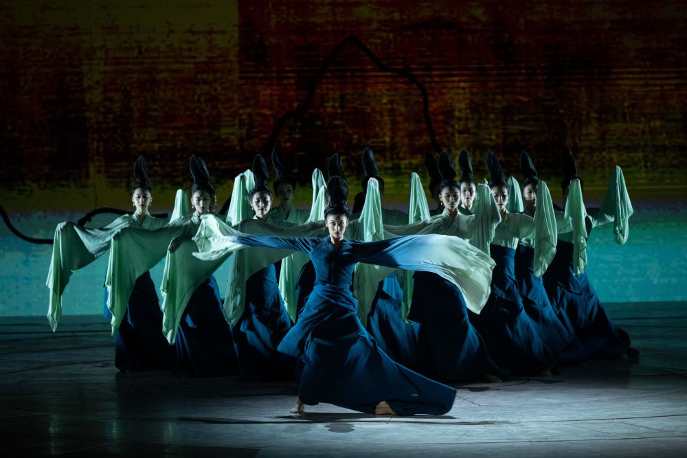 這是舞劇《唯我青白》的演出劇照(2024年8月16日攝)。該劇以器型為線索串聯(lián)篇章結(jié)構(gòu),以中華傳統(tǒng)美學(xué)引領(lǐng)創(chuàng)作,刻畫了宋元時(shí)期青白瓷手工匠人的典型人物。
