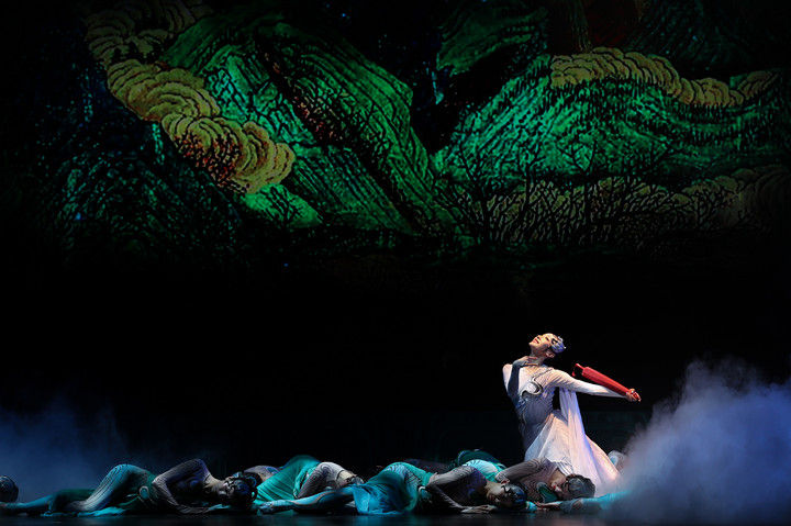 這是舞蹈詩(shī)劇《只此青綠》的演出劇照(2024年7月18日攝)?!吨淮饲嗑G》采用平行空間的敘事方式,從故宮博物院青年研究員的“展卷人”視角出發(fā),講述北宋著名畫家王希孟創(chuàng)作《千里江山圖》的故事。該劇連續(xù)3年穩(wěn)居中國(guó)舞劇票房榜首,全國(guó)巡演超800場(chǎng),赴多個(gè)國(guó)家和地區(qū)演出50余場(chǎng),成為傳統(tǒng)文化創(chuàng)新表達(dá)、中國(guó)藝術(shù)國(guó)際表達(dá)的典范之作。