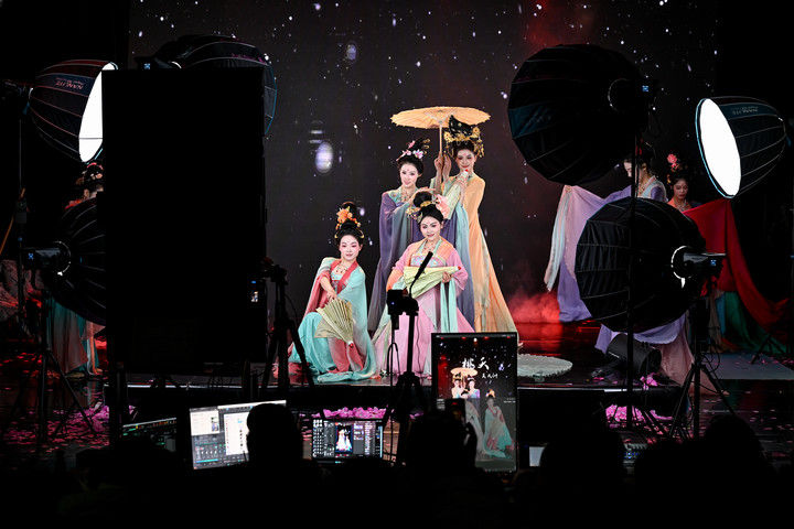 陜西省歌舞劇院的舞蹈演員在直播間進(jìn)行“團(tuán)播”表演(2025年12月25日攝)?!皥F(tuán)播”這一多人演藝直播新形式,正成為專業(yè)文藝院團(tuán)開辟線上“第二舞臺(tái)”、推動(dòng)傳統(tǒng)文化創(chuàng)新表達(dá)的新嘗試。“豎屏化”“快節(jié)奏”的改編,讓傳統(tǒng)劇目受到越來越多年輕人喜愛。數(shù)據(jù)顯示,陜西省歌舞劇院“團(tuán)播”單場(chǎng)最高曝光量超500萬(wàn),帶動(dòng)線下票房增長(zhǎng)約10%。