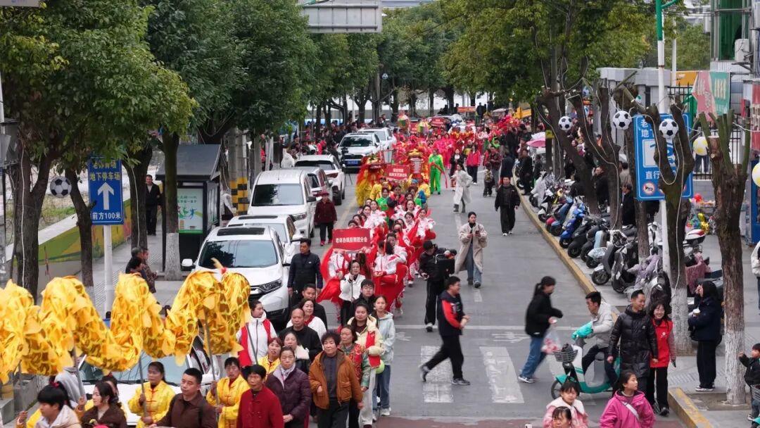 在主會場定點展演環(huán)節(jié),各支隊伍各顯神通。率先登場的威風(fēng)鑼鼓隊由老中青三代村民組成,整齊劃一的動作、雄渾震撼的節(jié)奏,敲出了鄉(xiāng)村振興的精氣神。彩獅隊則展現(xiàn)了半個多世紀(jì)的傳承堅守,這支成立于1972年的隊伍,隊員年齡跨度橫跨四代,紅綢舞動間,雄獅騰躍翻滾,贏得陣陣叫好。
