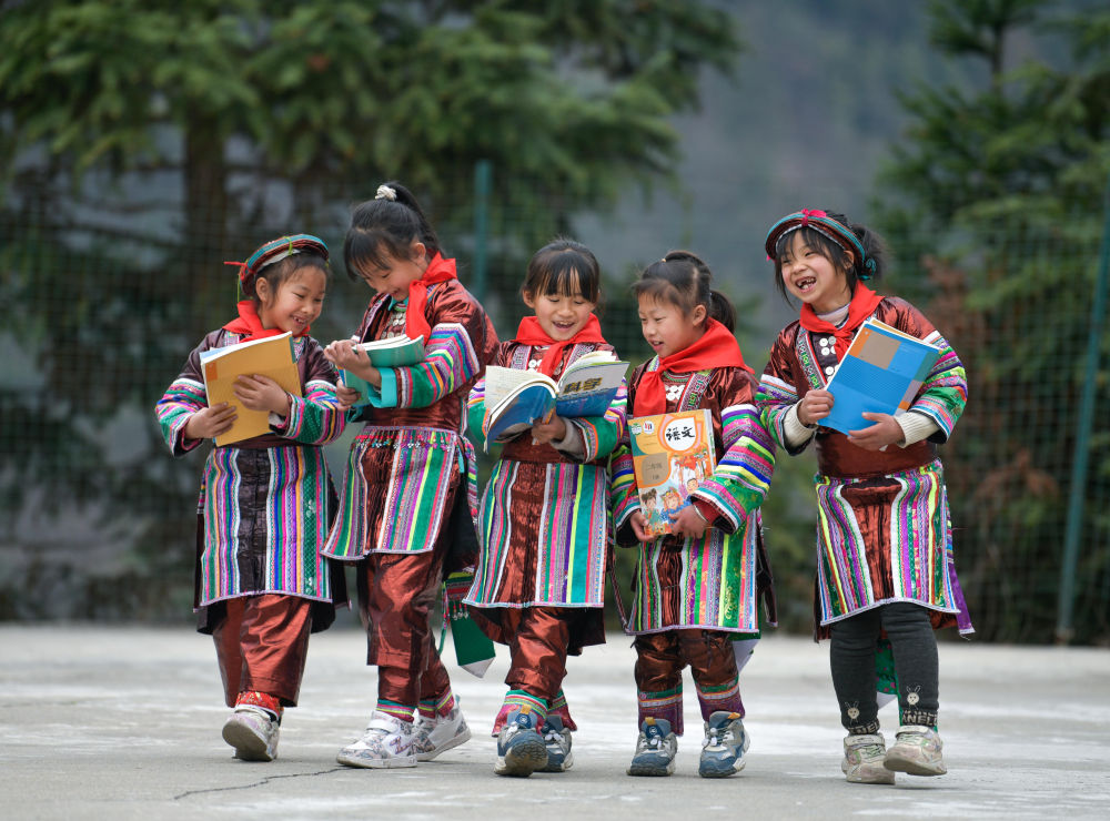 2023年2月16日,在貴州省從江縣西山鎮(zhèn)中寨教學(xué)點(diǎn),領(lǐng)到新書的瑤族學(xué)生在一起交流。新華社記者楊文斌攝