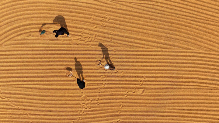 2025年10月28日,在山東省棗莊市市中區(qū)稅郭鎮(zhèn),農(nóng)民晾曬收獲的玉米(無人機(jī)照片)。新華社發(fā)(孫中喆 攝)