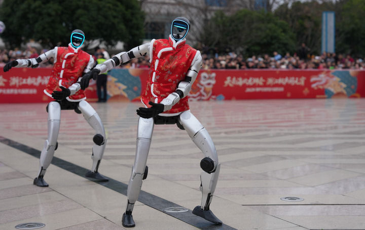 2026年2月28日,宇樹科技人形機(jī)器人在浙江省桐廬縣中心廣場表演舞蹈。新華社記者 黃宗治 攝
