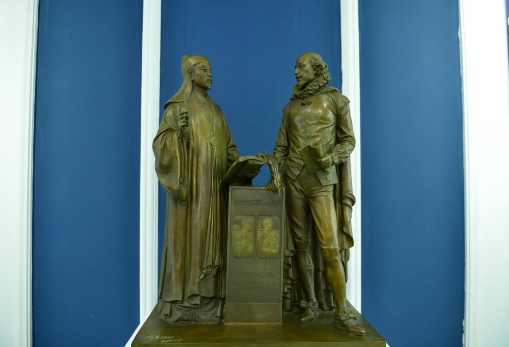 這是中國江西撫州湯顯祖紀(jì)念館陳列的湯顯祖遇見莎士比亞銅像(2016年10月12日攝)。新華社記者 周密 攝
