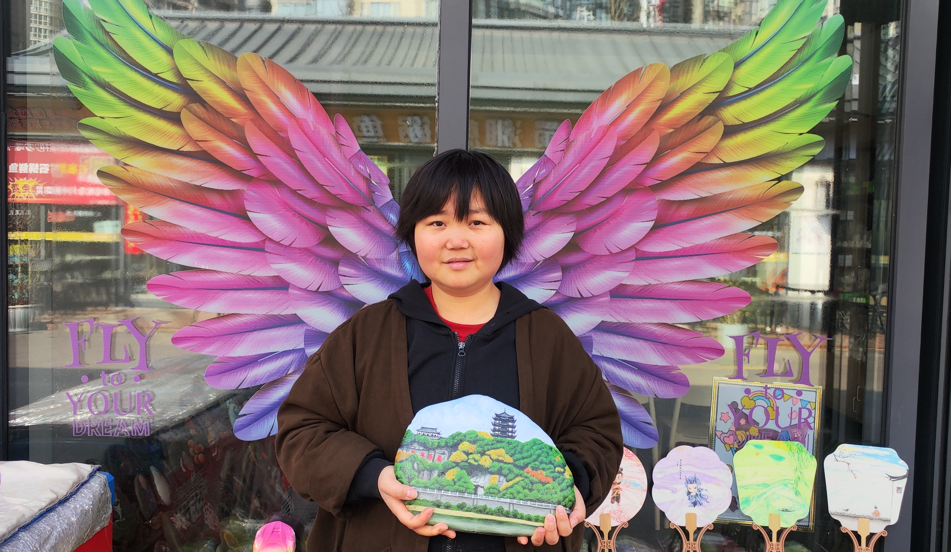 在她店鋪門口的玻璃柜上,貼著一雙展開的彩翼,手捧石頭畫的李景麗,眼神明亮、笑容溫婉,恰似破繭重生的蝴蝶,歷經(jīng)風(fēng)雨洗禮,依舊振翅翱翔,用手中的畫筆續(xù)寫著屬于自己的芳華,也用堅韌與熱愛,詮釋著新時代普通人不屈不撓、逐光前行的精神力量。