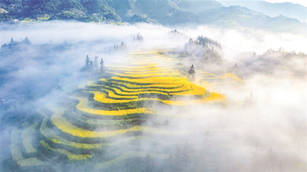 沿著蜿蜒的山路盤旋而上,轉(zhuǎn)過一個(gè)山坳,眼前豁然開朗——那金黃的油菜花,竟從山腳一直鋪到云端。層層疊疊的梯田,依著山勢(shì)盤旋而上,每一道田埂都勾勒出柔美的曲線。油菜花便順著這些曲線,開得浩浩蕩蕩,開得理直氣壯。晨霧未散時(shí),花海在薄紗般的霧氣里若隱若現(xiàn),恍若仙境;待太陽(yáng)升高,霧氣褪去,那金黃便愈發(fā)耀眼,直晃得人瞇起眼睛。風(fēng)過處,花浪翻涌,從這山傳到那山,沙沙的聲響里,滿是春天的氣息。
