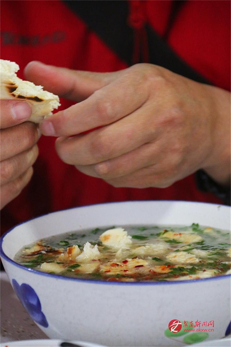 西安人把饃掰得如黃豆般大小,那是功夫;安康的饃,酥松,氣孔多,不用太用力,指尖輕輕一掐,便成了麻將大小的塊兒。掰不能太小,太小了泡進湯里就化了,沒了嚼頭;也不能太大,大了吸不進湯汁,外熱內(nèi)涼。最好是大小均勻,松散地堆在碗里,像是一座小山,等著那滾燙的羊湯來澆灌。
