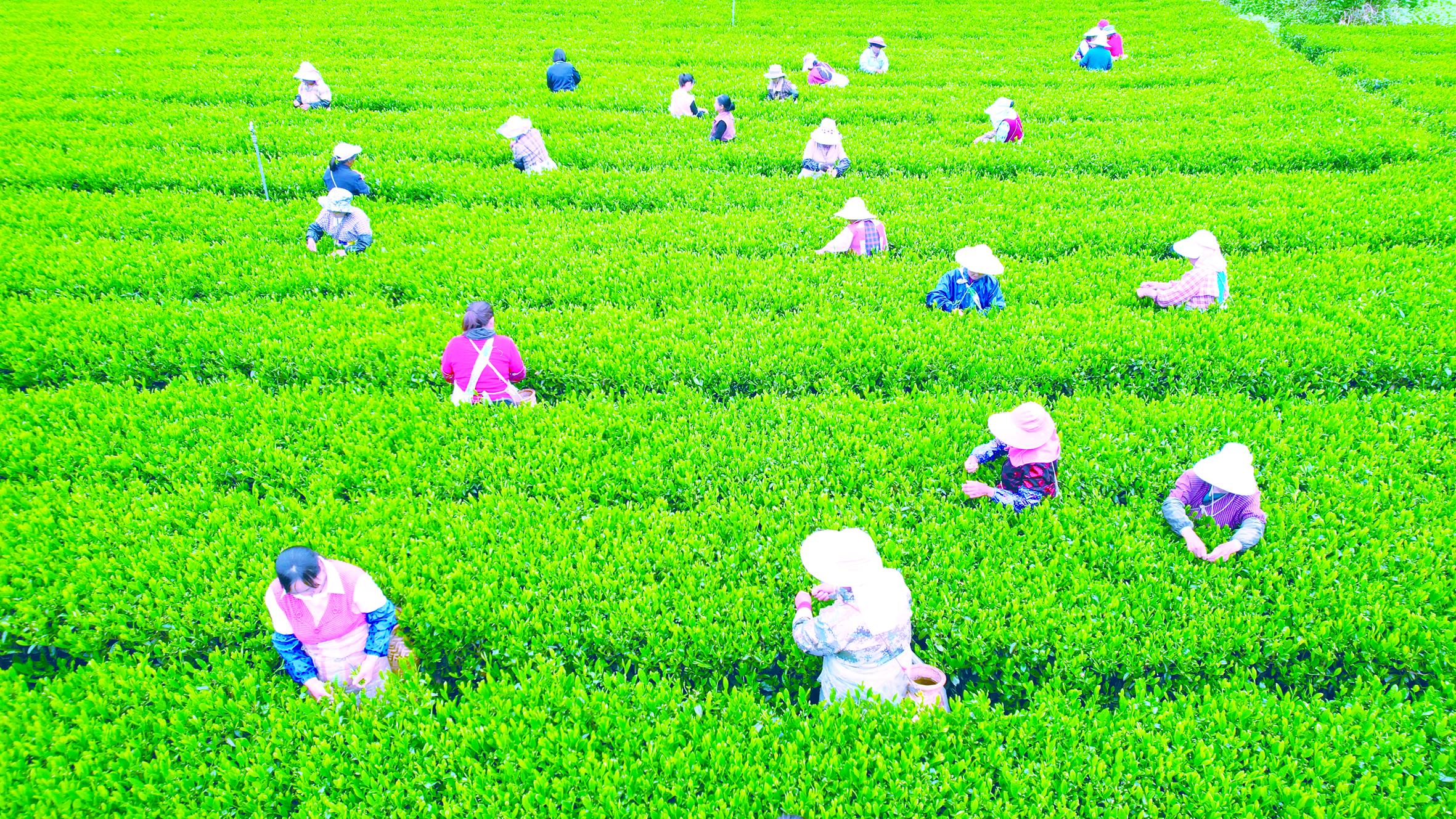 近日,在紫陽縣煥古鎮(zhèn)春堰村茶園基地,茶農(nóng)正在采摘春茶鮮葉。儲茂銀 攝