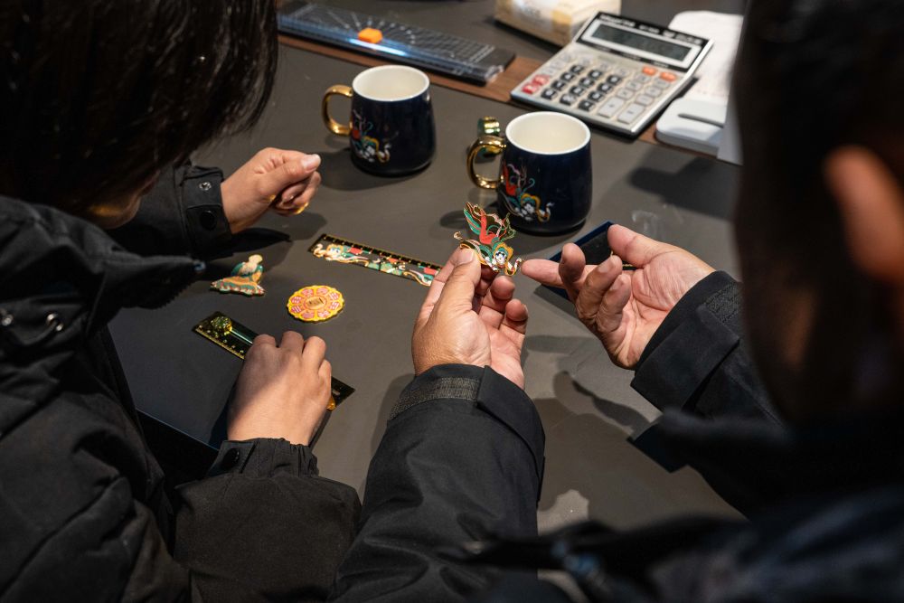 2026年1月15日,云南麗江白沙壁畫博物館館長楊志堅(jiān)(右)與同事討論文創(chuàng)產(chǎn)品設(shè)計(jì)。近年來,白沙壁畫博物館持續(xù)推動白沙壁畫赴廣東、上海等地展覽,主持編纂畫冊,并推進(jìn)數(shù)字化采集和文創(chuàng)開發(fā),讓壁畫藝術(shù)以新的形式走進(jìn)人們的日常生活。