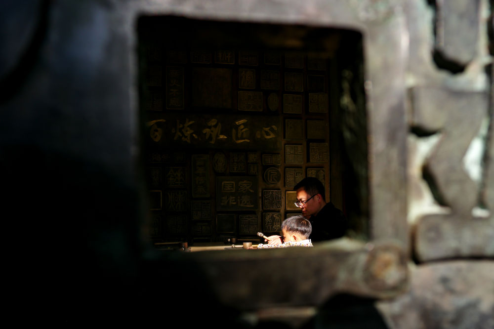 2026年3月25日,在云南曲靖會澤縣國家級非遺斑銅制作技藝傳習(xí)館,張氏斑銅第十三代傳人張偉在教兒子敲打銅器。會澤以“保護(hù)優(yōu)先、匠心修復(fù)、多元活化、融合共生”為路徑推進(jìn)古城活化保護(hù),對會館、民居等古建筑匠心修繕、活化利用,同時(shí)保留居民生活業(yè)態(tài),常態(tài)開展特色文化活動,用微改造提升古城環(huán)境。