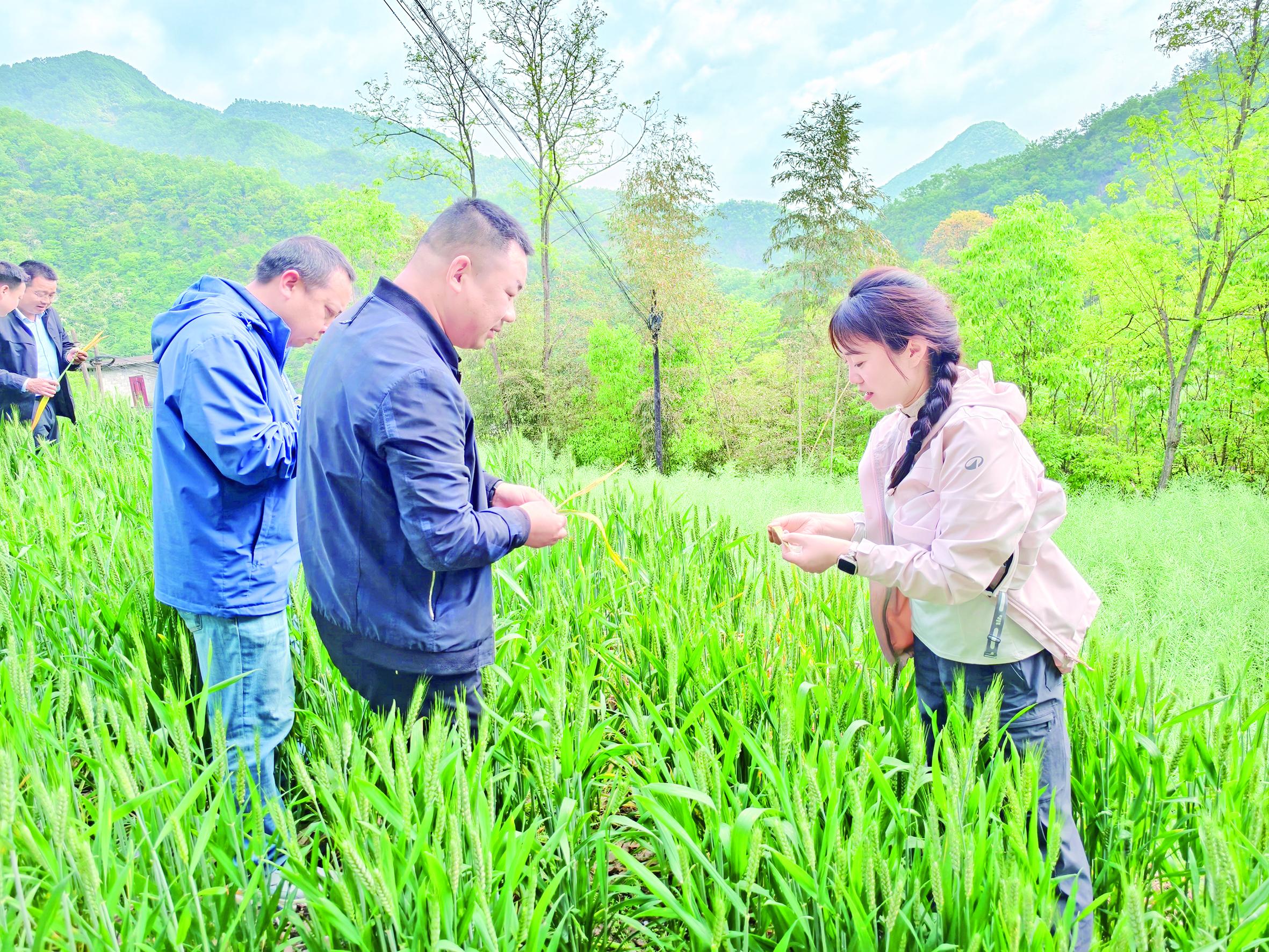 農(nóng)機(jī)專家在麥地指導(dǎo)小麥病蟲(chóng)害防控工作。