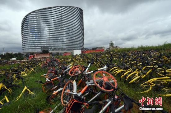9月9日,現(xiàn)場(chǎng)堆積如山的共享單車。近半年來,位于昆明市盤龍區(qū)的閑置荒地里堆放了大量的共享單車,數(shù)量已超萬輛。中新社記者 李進(jìn)紅 攝